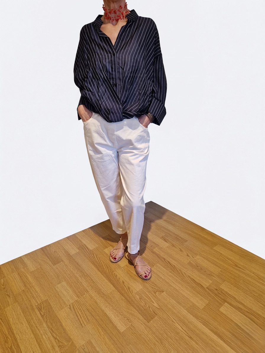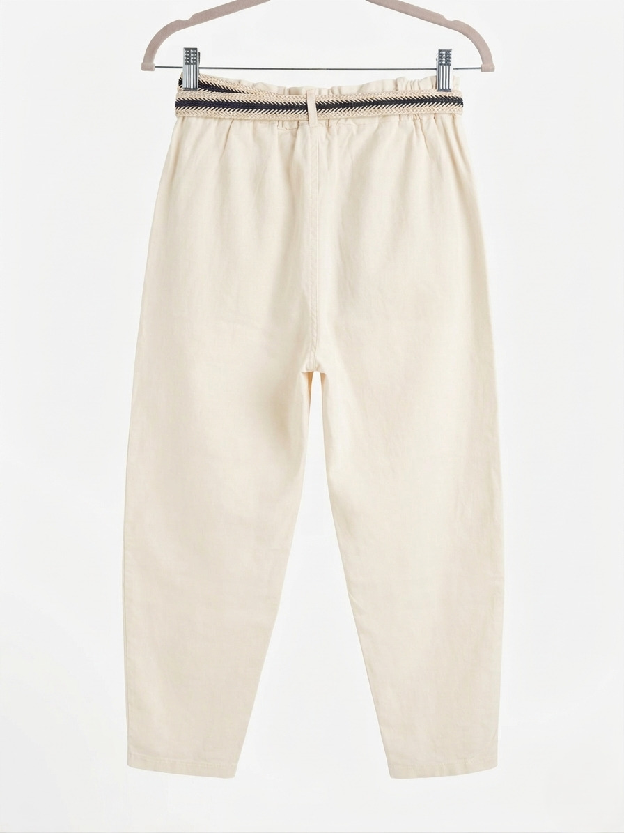 Pantalón corte moderno, de pierna ancha con un ligero estrechamiento hacia el tobillo. Su cintura elástica con fruncido que garantiza un ajuste cómodo y flexible a diferentes figuras.